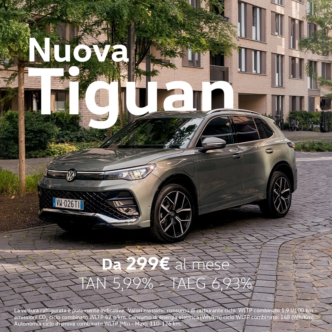 Nuova Tiguan Edition Plus 1.5 eTSI 130 CV DSG tua a € 37.026,00 (chiavi in mano IPT esclusa). Prezzo di Listino € 41.000,00. Il prezzo in promozione di € 37.026,00 è calcolato tenendo in considerazione un contributo della marca Volkswagen e delle Concessionarie Volkswagen aderenti all'iniziativa pari ad € 3.974,00 - Anticipo € 5.000,00 - Finanziamento di € 32.406,00 in 35 rate da € 299. Interessi € 5.266,30 - TAN 5,99% fisso - TAEG 6,93% - Valore Futuro Garantito pari alla Rata Finale di € 26.158,00, per un chilometraggio totale massimo di 30.000 km - In caso di restituzione del veicolo eccedenza chilometrica 0,20 euro/km. Spese istruttoria pratica € 380,00 (incluse nell'importo totale del credito) - Importo totale del credito € 32.406,00 - Spese di incasso rata € 3,40 / mese - costo comunicazioni periodiche € 0 (in caso di invio cartaceo, il costo è pari ad 1€/anno) - Imposta di bollo/sostitutiva € 81,01 - Importo totale dovuto dal richiedente € 37.878,71. Offerta valida per cliente privato - Gli importi fin qui indicati sono da considerarsi IVA inclusa - Informazioni Europee di Base sul Credito al Consumo, Fogli Informativi e condizioni dei servizi accessori disponibili presso le Concessionarie Volkswagen. Salvo approvazione Volkswagen Financial Services. Volkswagen Financial Services è un marchio commerciale condiviso dalle succursali di Volkswagen Bank GmbH (p. IVA 12513730155) per il credito al consumo, per il leasing finanziario e per i prodotti assicurativi e Volkswagen Leasing GmbH (p. IVA 12549080153) per il noleggio e i piani di manutenzione. Il prodotto Progetto Valore Volkswagen è realizzato e distribuito da Volkswagen Bank GmbH. Offerta valida sino al 30.04.2026 in caso di permuta o rottamazione. La vettura raffigurata è puramente indicativa.