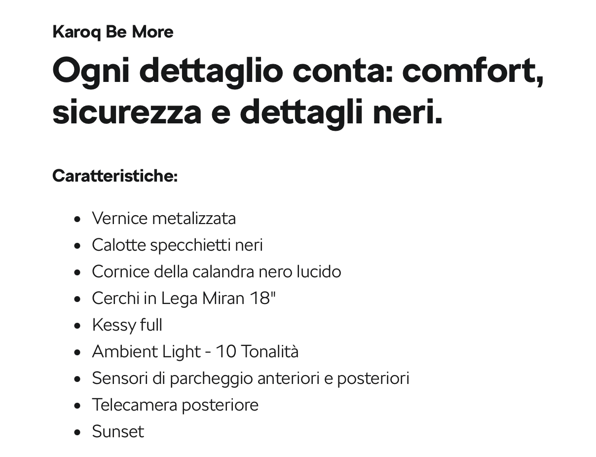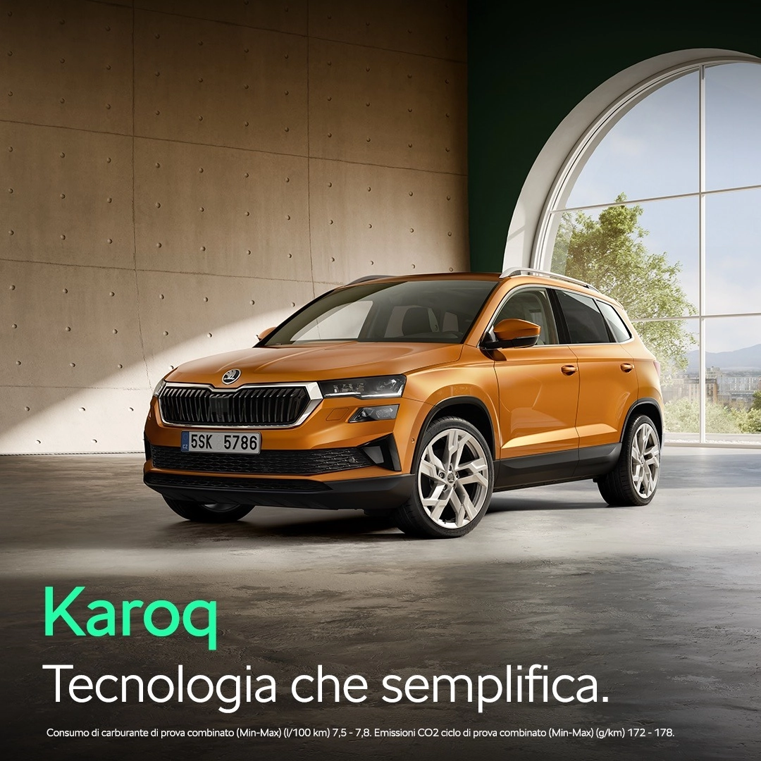 Škoda Karoq Be More 1.0 TSI 115CV. Prezzo di Listino a € 34.400,00. Prezzo Promozionato a € 27.067,60 (chiavi in mano IPT esclusa) solo in caso di adesione al servizio di ŠKODA Care 36 Mesi 45.000 Km (importo totale € 470,01) e comprensivo di Extended Warranty anni 2+2 o 60.000 Km con contributo della marca Škoda e delle Concessionarie aderenti all’iniziativa. Offerta valida fino al 30/04/2026 in caso di permuta/rottamazione e sottoscrizione di finanziamento Škoda Clever Value. Esempio di finanziamento Škoda Clever Value: Anticipo € 3.000,00 - Finanziamento di € 24.917,60 in 35 rate da € 249,00. Interessi € 2.621,08 - TAN 3,99% fisso - TAEG 5,02% - Valore Futuro Garantito pari alla Rata Finale di € 18.823,68 per un chilometraggio totale massimo di 45.000 km. In caso di restituzione del veicolo eccedenza chilometrica 0,20 €/km - Incluso il servizio facoltativo ŠKODA Care 36 Mesi 45.000 Km (€ 470,01) - Spese istruttoria pratica € 380,00 (incluse nell'importo totale del credito) - Importo totale del credito € 24.917,60 - Spese di incasso rata € 3,4/mese - costo comunicazioni periodiche € 0,00 (in caso di invio cartaceo, il costo è 1€/anno) - Imposta di bollo/sostitutiva € 62,29 - Importo totale dovuto dal richiedente € 27.726,37. Offerta valida per cliente privato - Gli importi fin qui indicati sono da considerarsi IVA inclusa ove previsto - Informazioni europee di base sul Credito al Consumo, Fogli informativi e condizioni dei servizi accessori disponibili presso le Concessionarie Škoda. Salvo approvazione Škoda Financial Services.